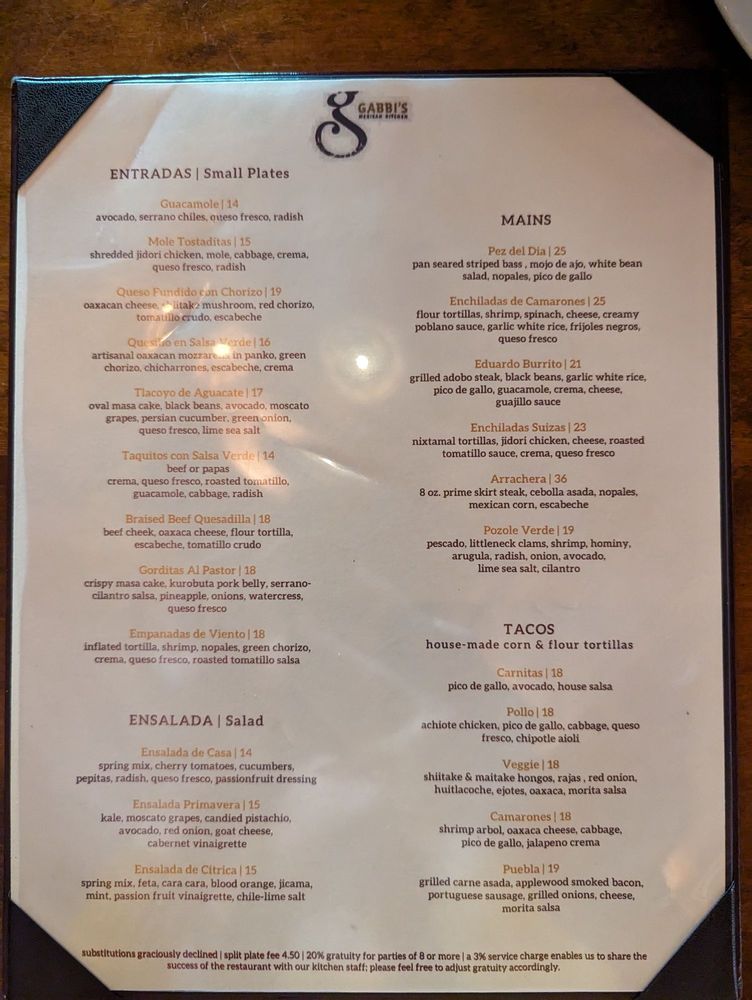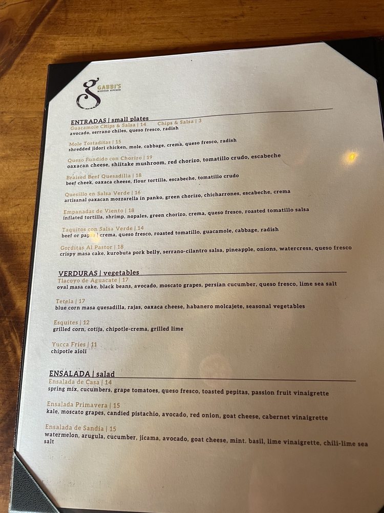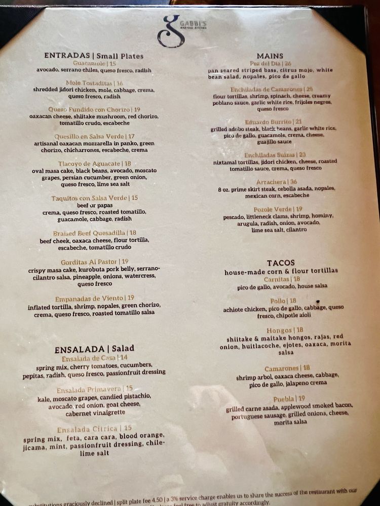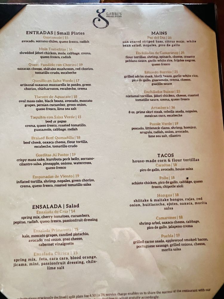 Gabbi's Mexican Kitchen in Orange, California, offers a variety of Mexican dishes with a modern twist. The menu features unique items such as Seasonal Guacamole with pomegranate seeds, Empanadas de Viento with shrimp and green chorizo, and Tlapeo Soup with chicken and avocado. Customers rave about the flavors and presentation of the food, with standout items being the arrachera skirt steak and the Pozole Verde seafood soup. The restaurant's ambiance is described as authentic and inviting, giving off a vibe reminiscent of Mexico. Positive reviews highlight the attentive service and delicious cocktails, such as the house margaritas and passion fruit margarita. Overall, Gabbi's Mexican Kitchen is a must-visit for those looking for elevated Mexican cuisine in a trendy setting.