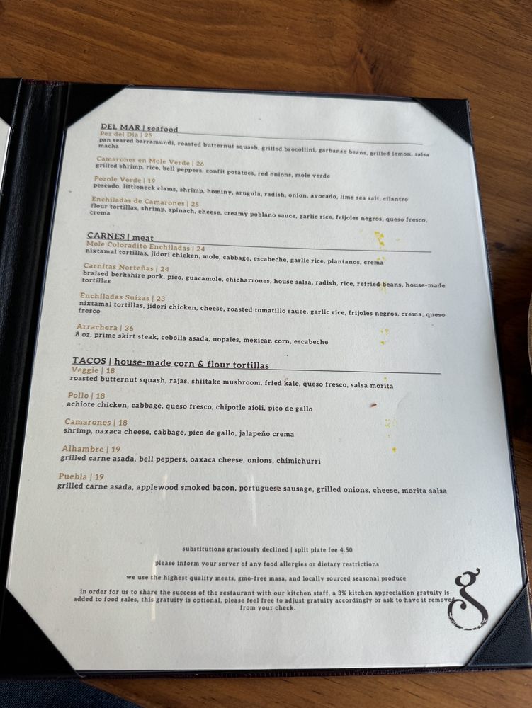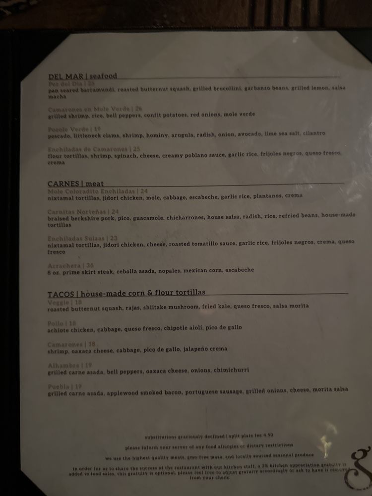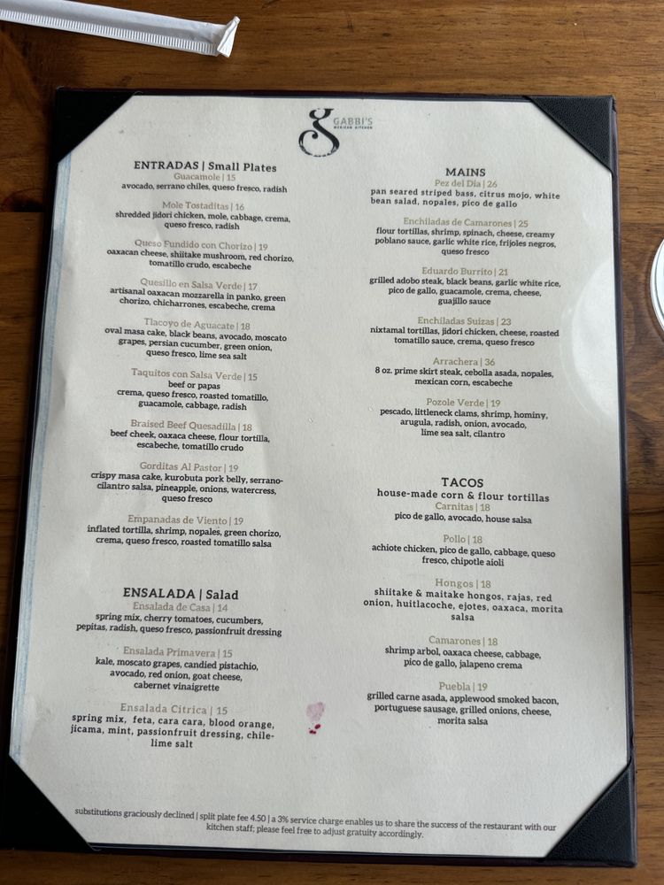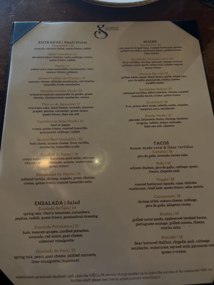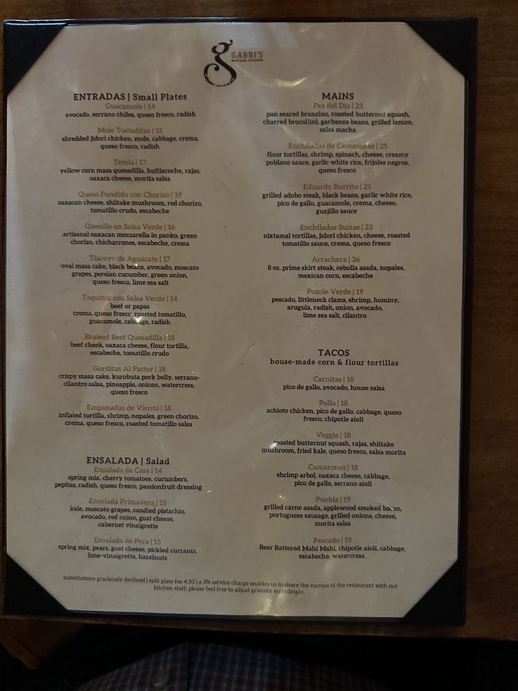 Gabbi's Mexican Kitchen in Orange, California, offers a variety of Mexican dishes with a modern twist. The menu features unique items such as Seasonal Guacamole with pomegranate seeds, Empanadas de Viento with shrimp and green chorizo, and Tlapeo Soup with chicken and avocado. Customers rave about the flavors and presentation of the food, with standout items being the arrachera skirt steak and the Pozole Verde seafood soup. The restaurant's ambiance is described as authentic and inviting, giving off a vibe reminiscent of Mexico. Positive reviews highlight the attentive service and delicious cocktails, such as the house margaritas and passion fruit margarita. Overall, Gabbi's Mexican Kitchen is a must-visit for those looking for elevated Mexican cuisine in a trendy setting.